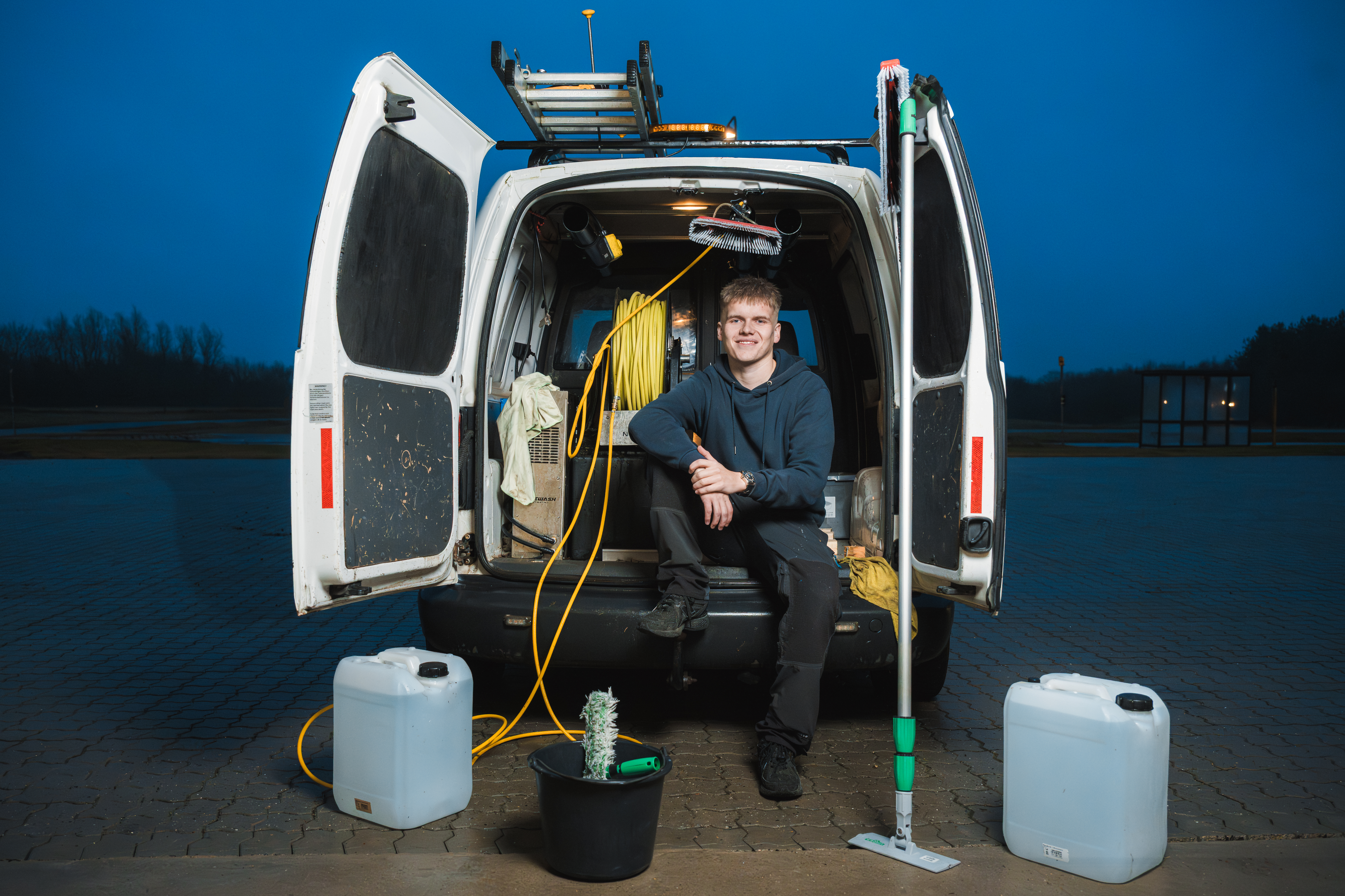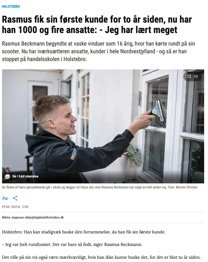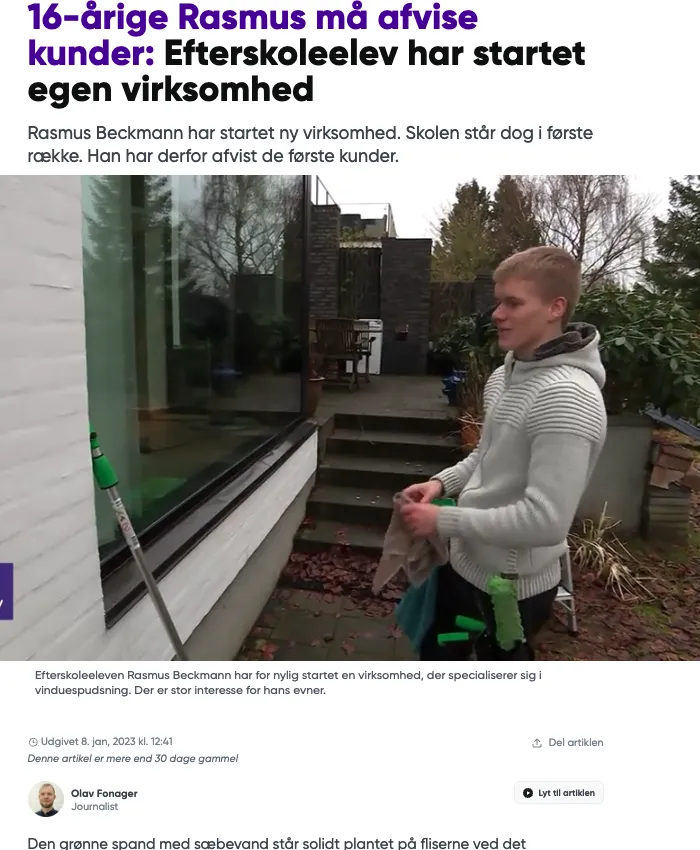 Det var her Rasmus startede sin egen virksomhed, Vinduespudser Beckmann - hvor han kørte rundt på scooter og pudsede vinduer.